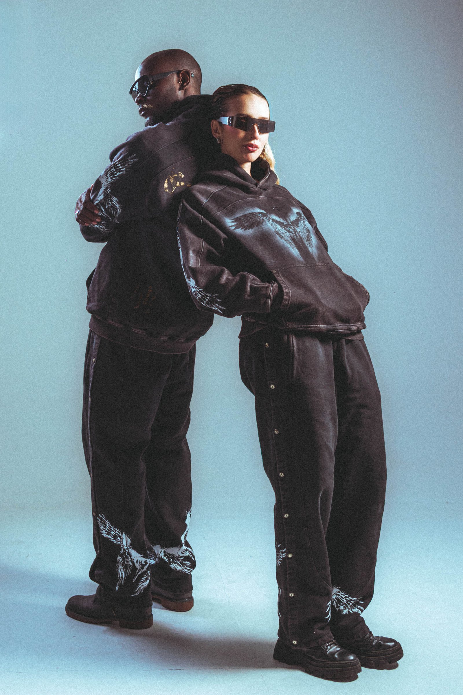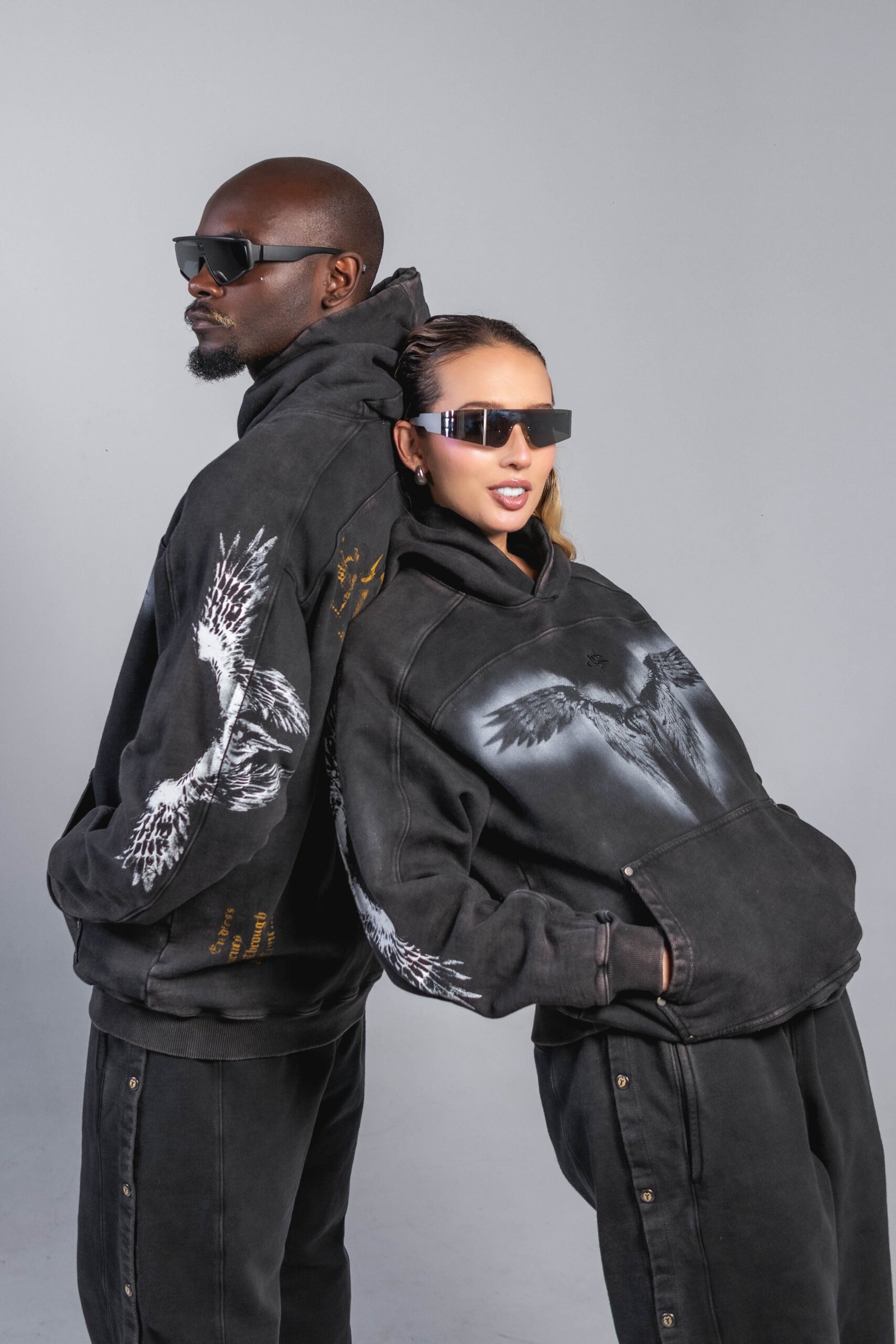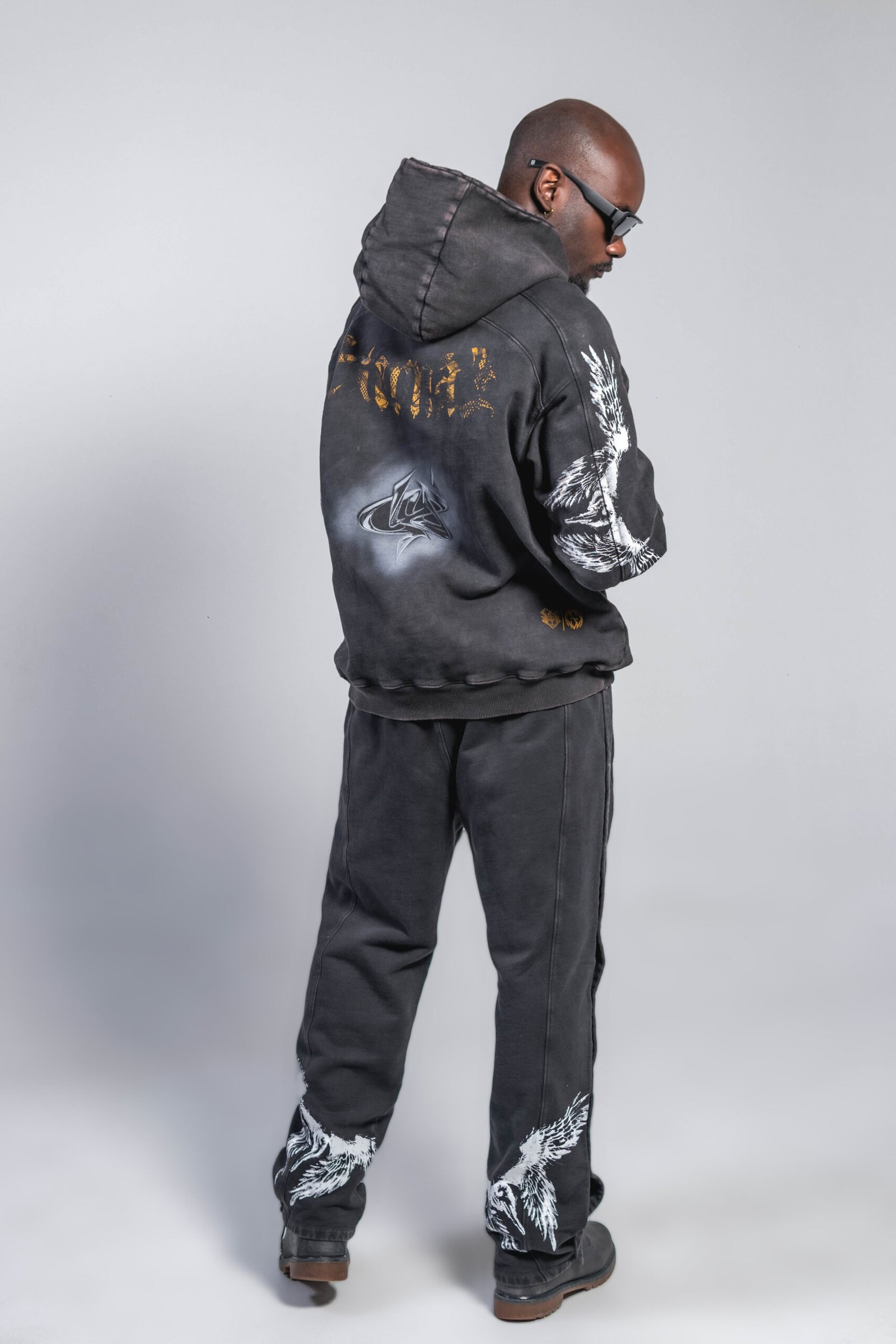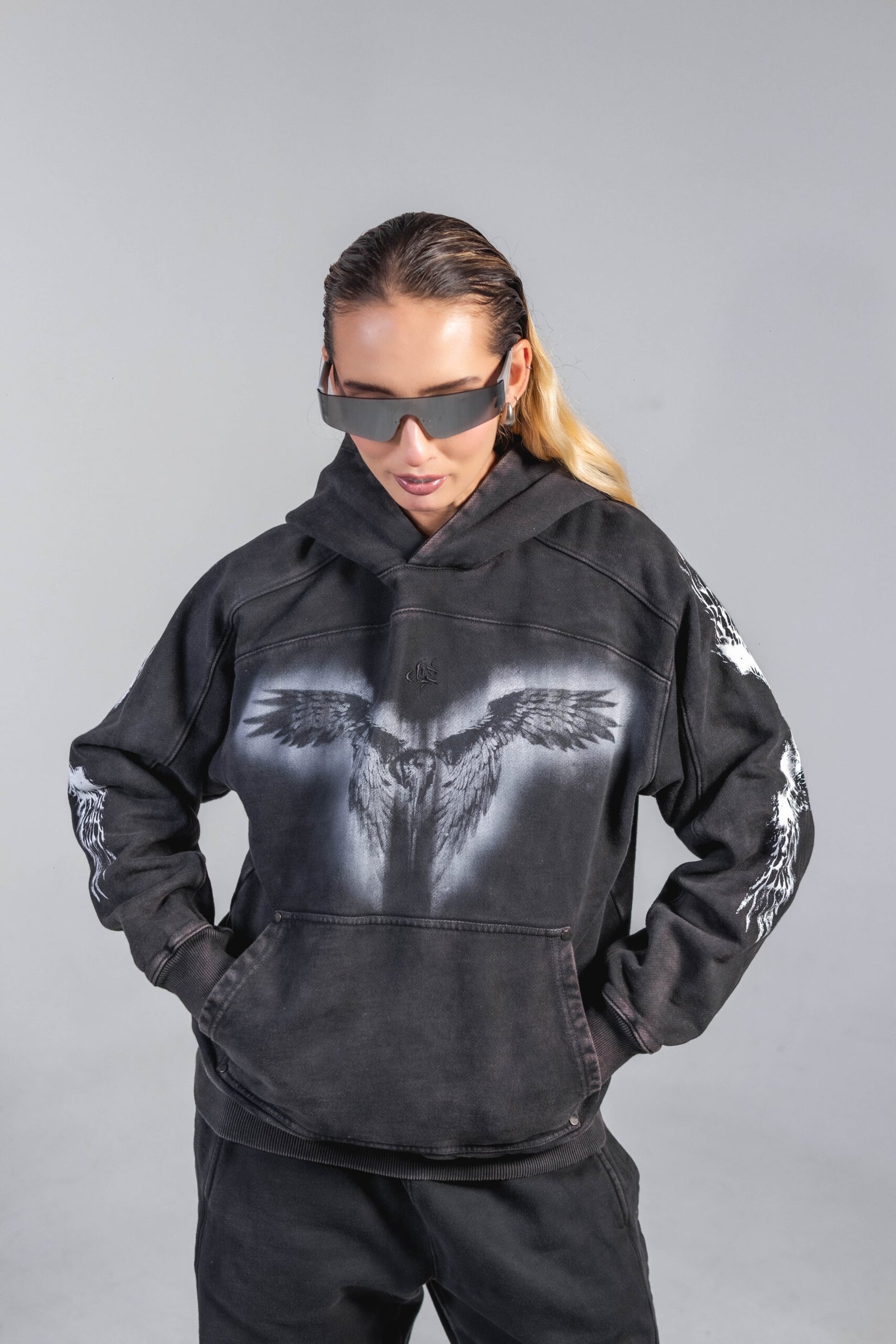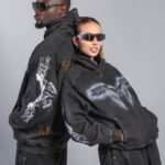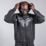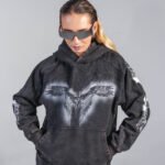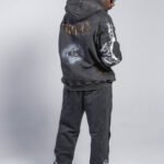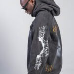 Buzo en tono gris oscuro/negro, confeccionado en algodón 100% de 430 g, con lavado enzimático que genera un acabado vintage uniforme. Incluye estampación en serigrafía de alta definición en pecho, mangas y espalda, además de detalles en taches metálicos. Capucha amplia, puños y ruedo en rib, bolsillo tipo canguro y corte relajado, estructura y tacto suave.