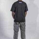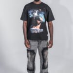 Camiseta negra en algodón peruano 100% de 260 g, con cuello en rib y estampación en serigrafía de alta definición. El gráfico frontal combina composición fotográfica y efectos ilustrados en tonos fríos, con acabado nítido y gran profundidad visual. Corte amplio y estructura, y tacto suave.
