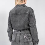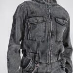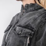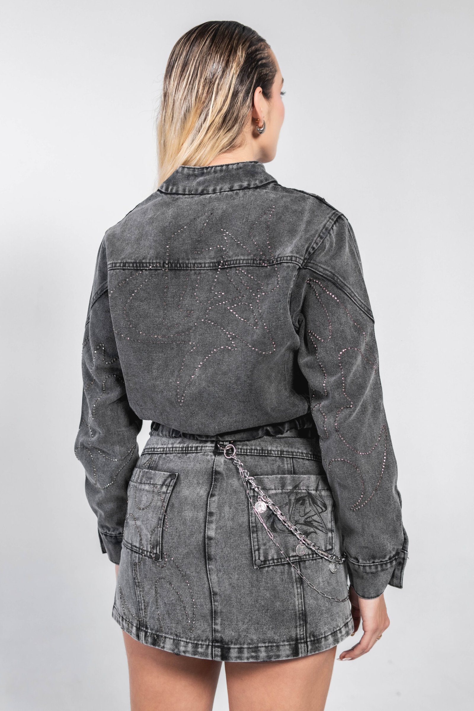 Chaqueta gris acid wash en denim 100% algodón, con cierres de lujo, logo CHS en piedras y detalles tribales en piedras sobre las mangas. Presenta bolsillos funcionales, costuras marcadas y construcción reforzada, ofreciendo un acabado texturizado y definido