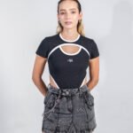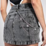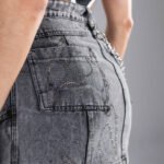 Falda gris acid wash en denim 100% algodón, con aplicaciones de piedras en la parte delantera y posterior, bolsillos estructurados y estampado en serigrafía. Presenta costuras marcadas, construcción reforzada y un acabado texturizado que equilibra resistencia, brillo y definición en la prenda.